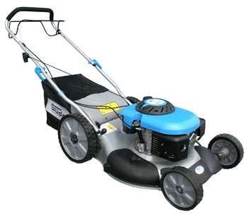 Benzin-Rasenmäher mit OHV 4-Takt-Motor, wirtschaftlich im Verbrauch und mit pulverbeschichtetem Stahlblech Gehäuse. Ausstattung: Ergonomisch geformter Führungsholm, 6-fach zentrale Komfort-Schnitthöhenverstellung und 60 Liter Grasfangsack für ausreichende Mähzeit. Kugelgelagerte 300 mm große Räder hinten und 200 mm vorne für leichtes Fahren auch auf unebenen Flächen. Verstellbarer Seitenauswurf. Antrieb: Radantrieb Funktionen: Mähen, Sammeln, Mulchen, Seitenauswurf Einsatzgebiete: Für mittlere bis große Rasenflächen Technische Daten: Motor: 3,8 kW/5,1 PS (max. bei 3600 min-1) Hubraum: 173 ccm Leerlaufdrehzahl: 2850 min-1 Max. Schnittbreite: 550 mm Fangkorbvolumen: 60 l 5-fach Höhenverstellbar: 25-75 mm Lärmwertangabe LWA: 98 dB Gewicht: 36 kg Maße L x B x H: 1520 x 580 x 1000 mm